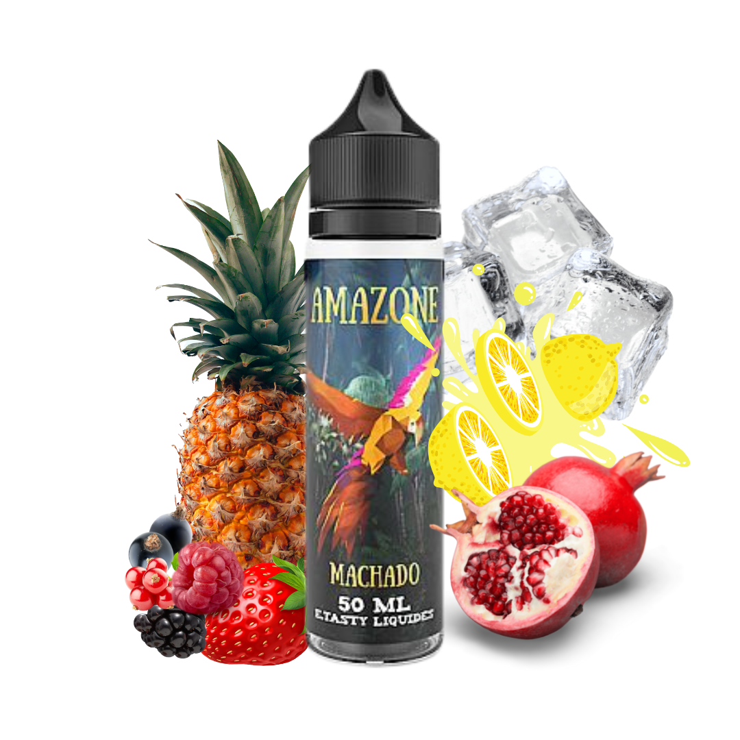 Le e-liquide Amazone Machado propose un cocktail fruité équilibré et rafraîchissant. Le goût sucré de l'ananas s'harmonise parfaitement avec le mélange de fruits rouges citronnés, pour une saveur légèrement acidulée. La grenade apporte une fraîcheur intense et prolonge le plaisir de cette combinaison unique de saveurs.