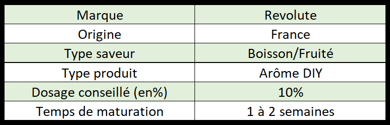 Afin d'être certain d'un rendu aromatique équilibré, il est conseillé de respecter un certain temps de maturation (appelé également steep). Un steep d'1 à 2 semaines est conseillé pour ce concentré fruité.