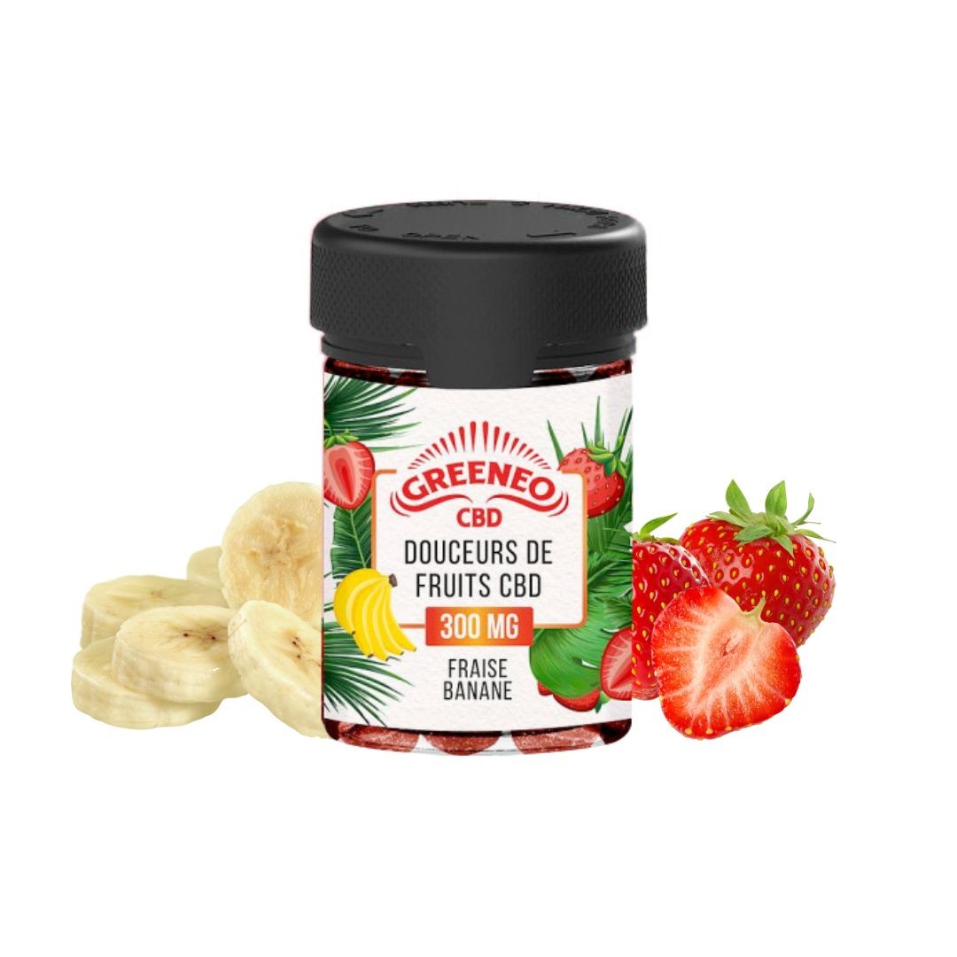 Les bonbons Douceurs de Fruits CBD fraise banane de Greeneo sont des bonbons au goût fruité et acidulé qui contiennent 10mg de CBD chacun.