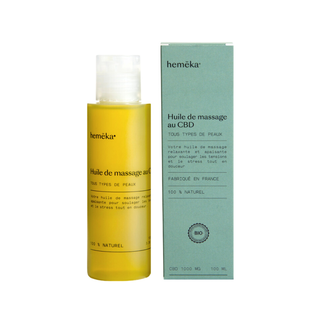 Avec l'huile de massage au CBD Bio d'Heméka, vous pourrez dire adieu aux tensions et au stress !