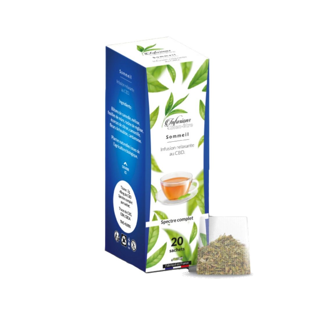 Composition par sachet : Tisane 2g, 40mg de CBD spectre complet.